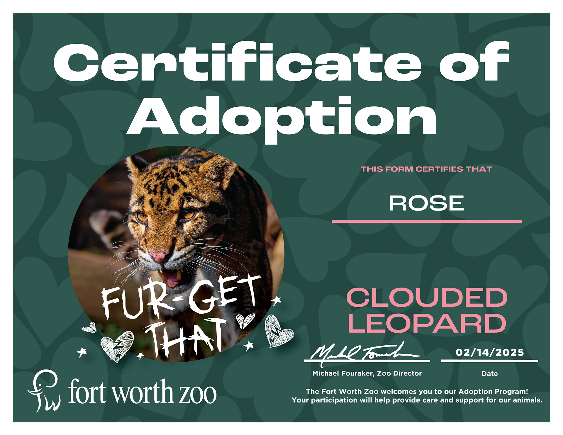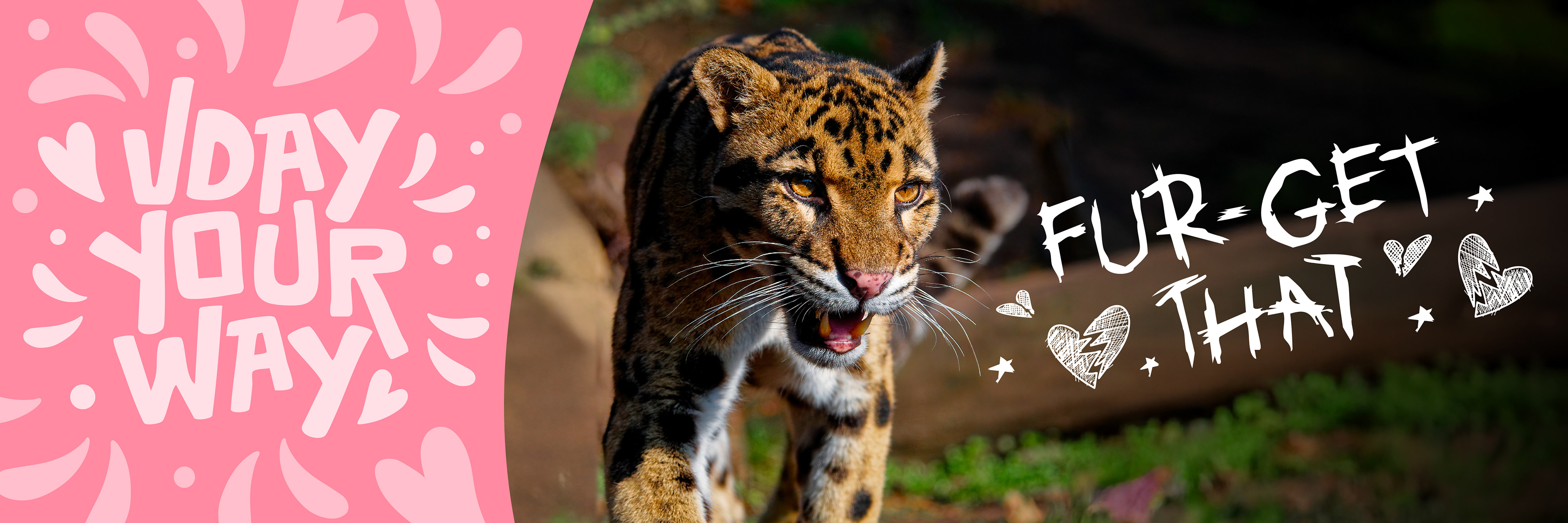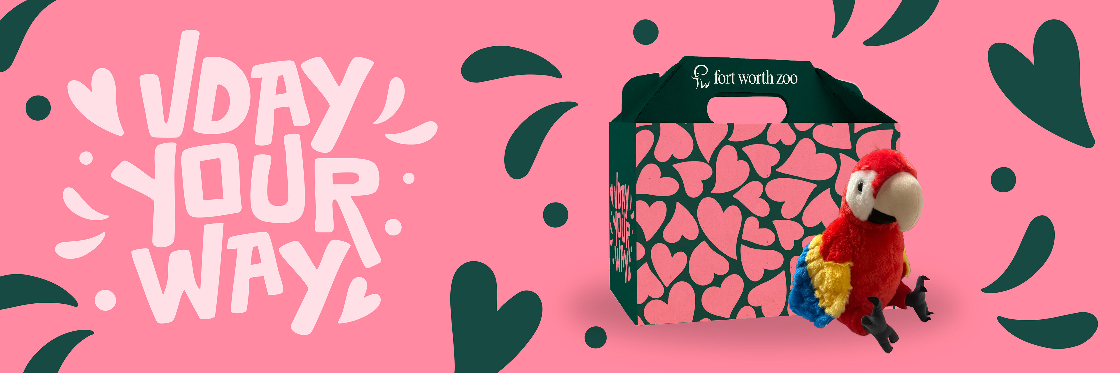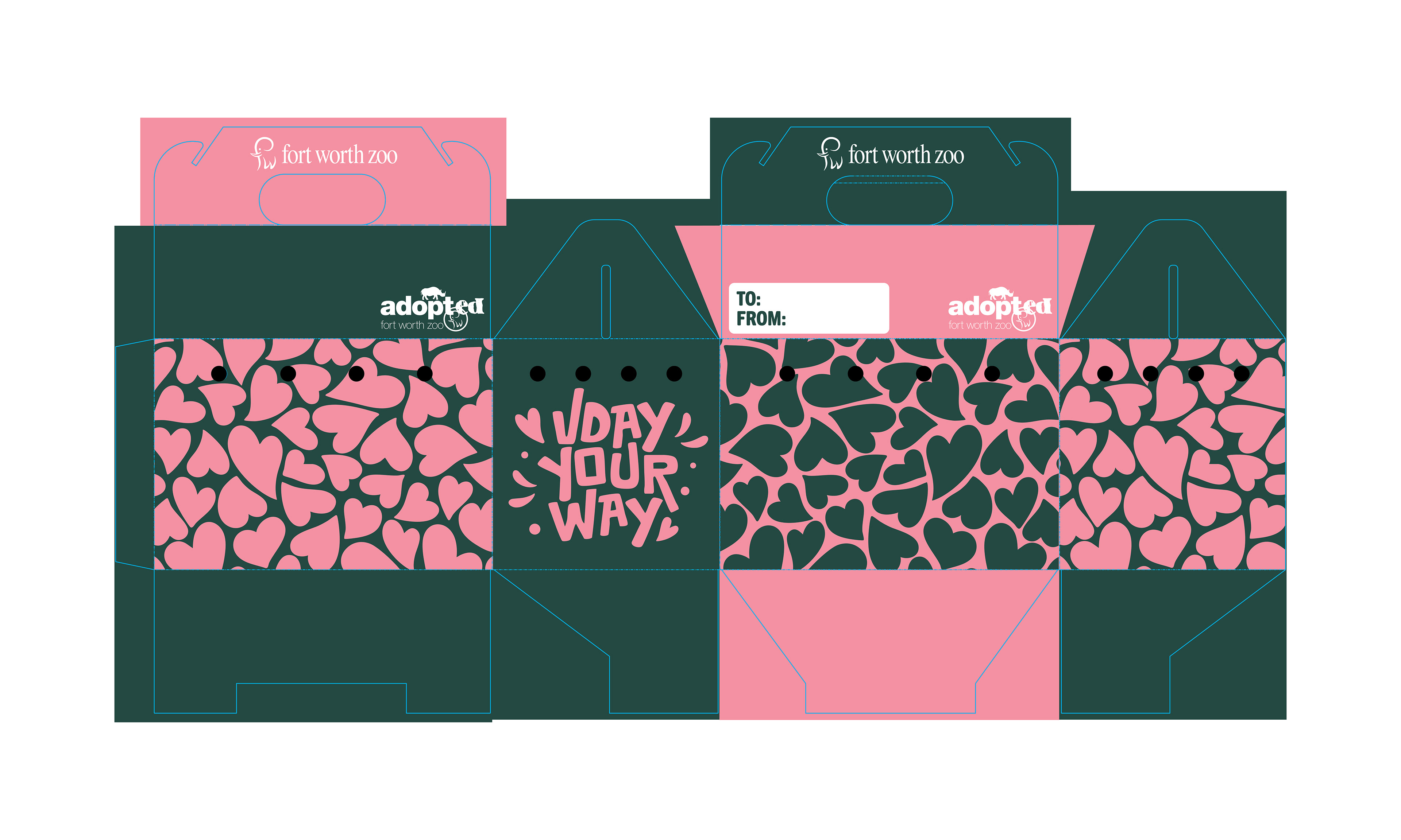 Create a Valentine’s Day adoption box for the Fort Worth Zoo. Include themed taglines for the African Painted Dog, African Lion, and African Penguin to build a V-Day campaign that encourages guests to “adopt” a furry friend. All imagery must be two-toned and rendered in halftone dots to accommodate printing on the physical box. Deliverables include the adoption box package, event signage, and accompanying ephemera.